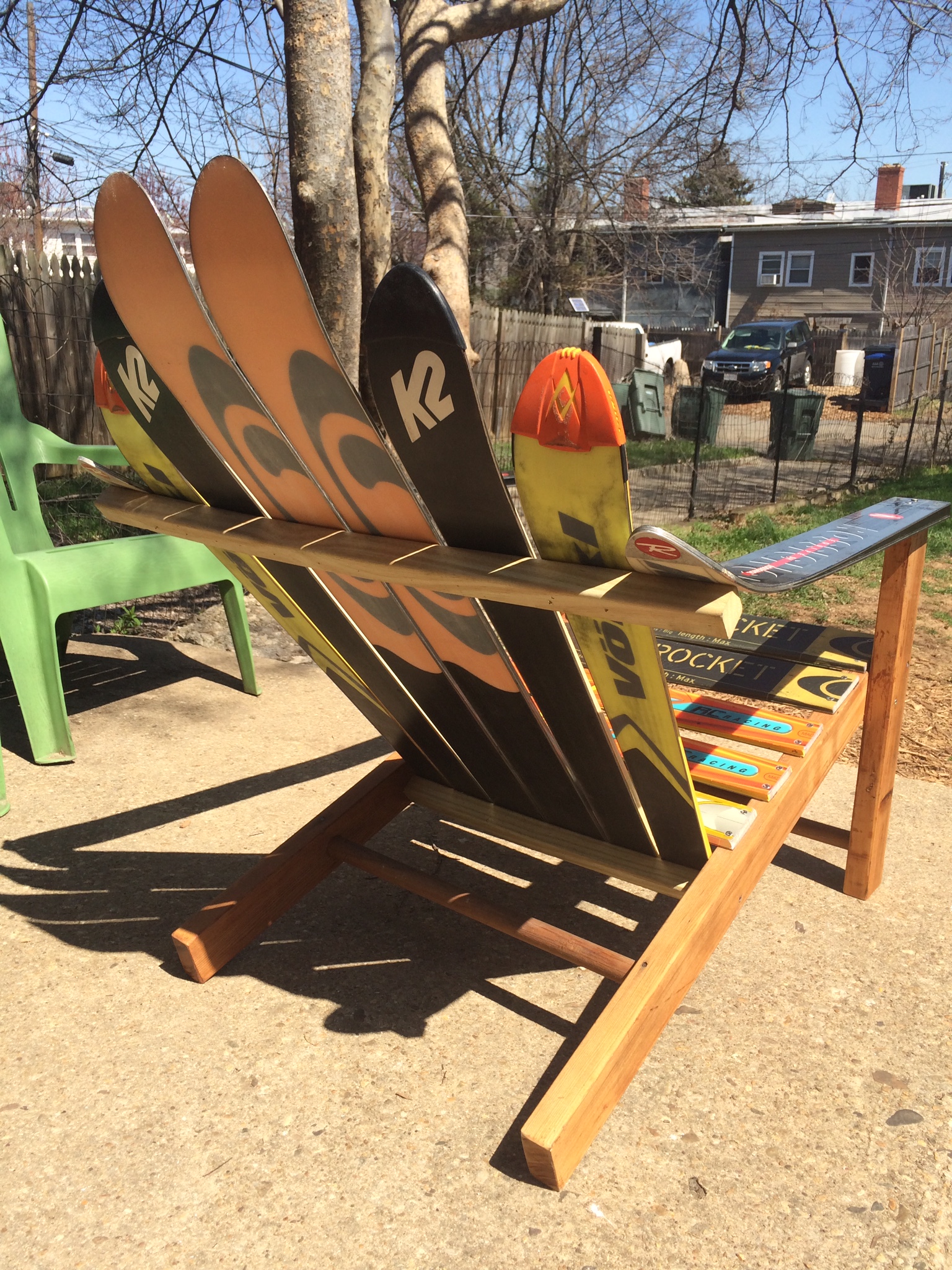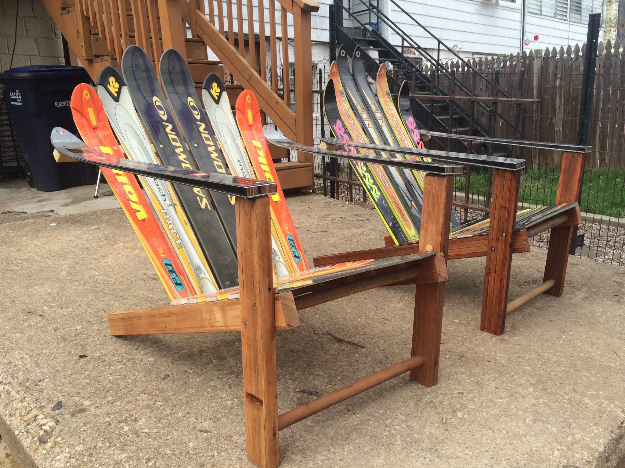 I just finished these Adirondack Chairs created from all my old skis! They came out great and are very comfortable. It’s a unique design using all re-claimed pieces to create a very durable chair that’s also a terrific conversation starter. I used an organic, raw linseed oil finish on the wood frames, which gives it a rich look. Every time I sit down in them memories come flooding back: going 80mph, first Whistler trip, the thrill of just skiing!