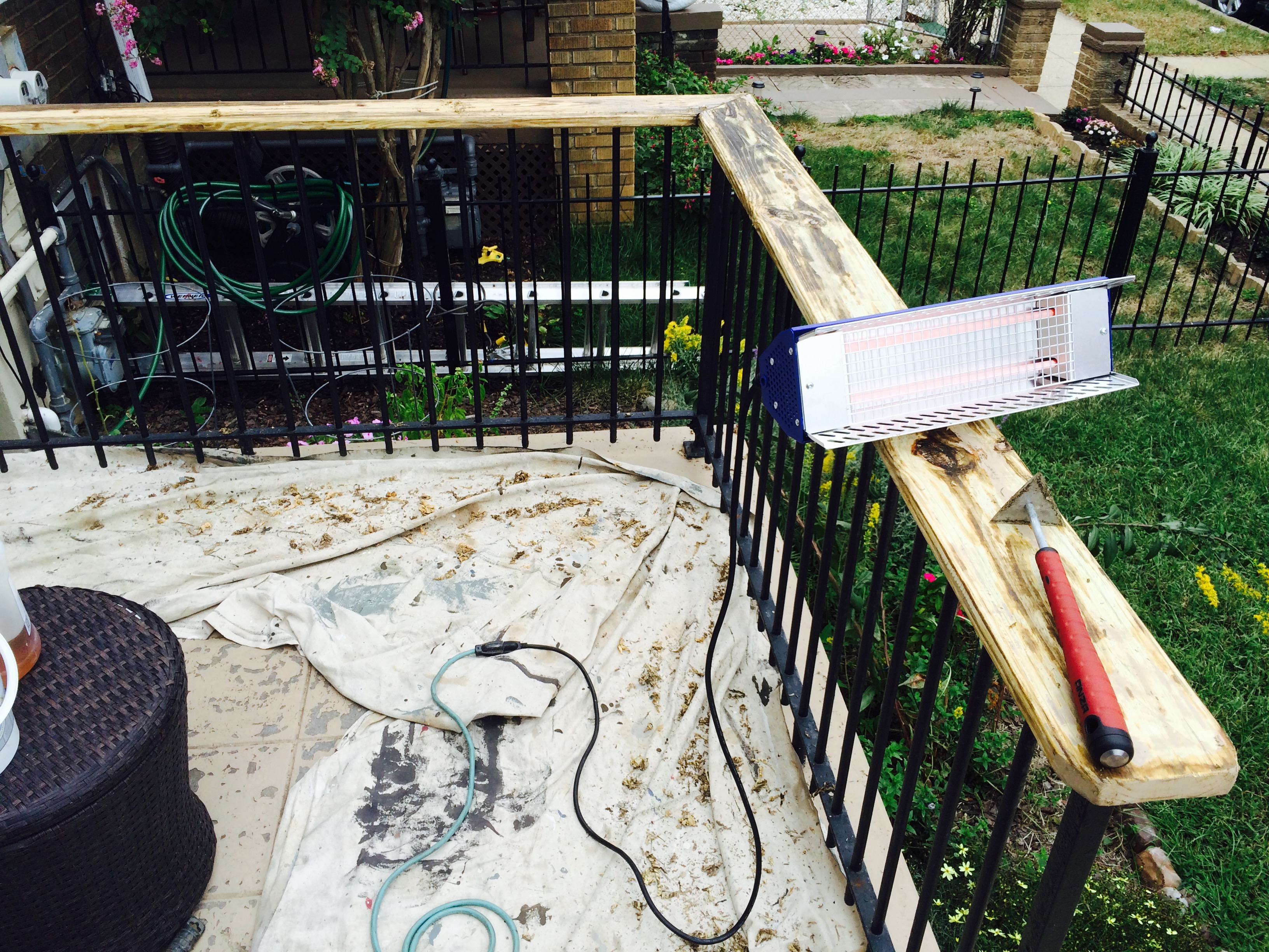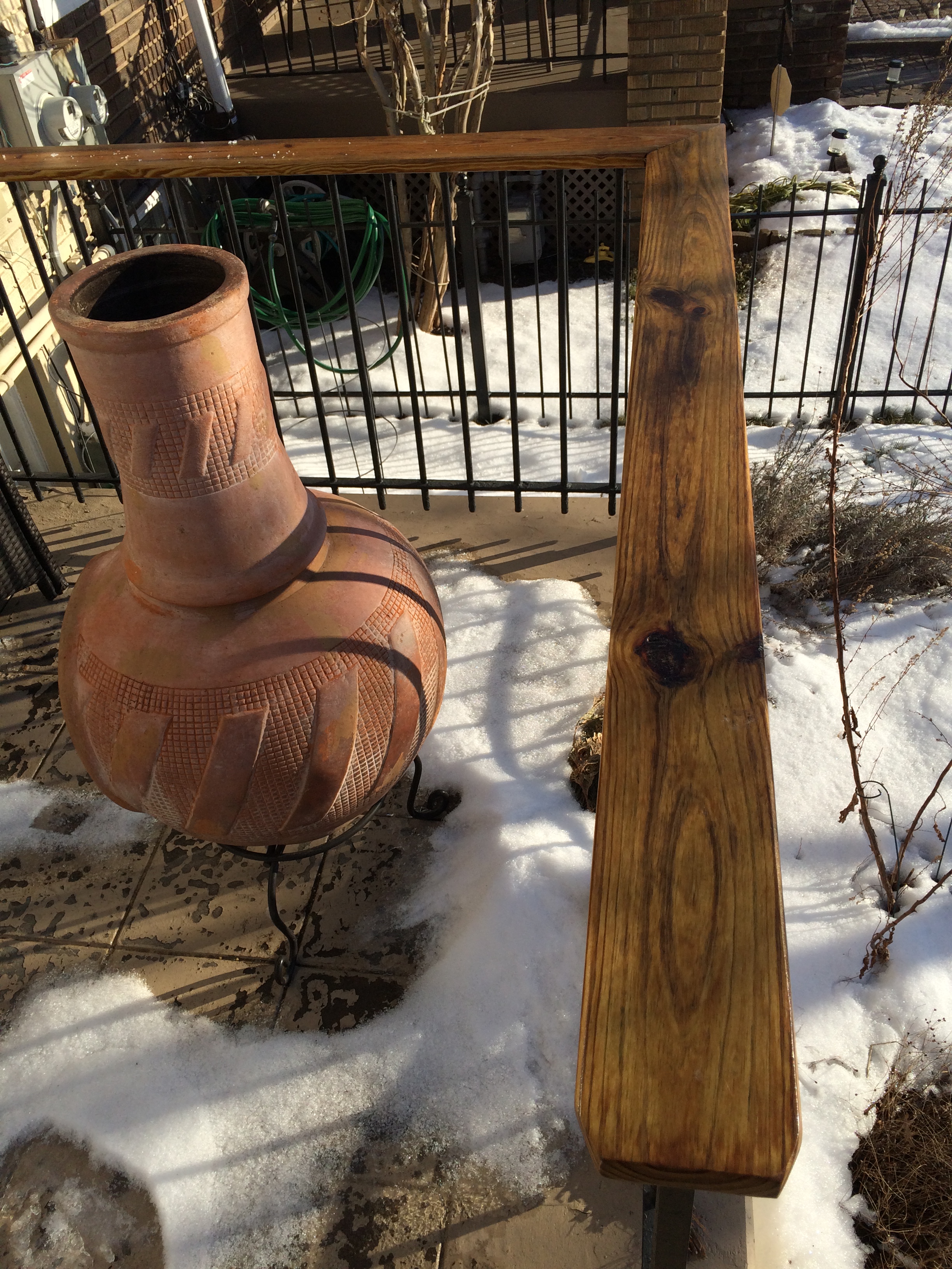 This pressure treated railing was dried out and the acrylic stain that was on it had failed plus the wood warped. I remove the old layer of stain with my in fared paint remover then oiled the wood with raw organic linseed oil and finished it with linseed oil varnished. over a year later it still looks great. The longevity of this finish is well over ten years!! Unheard of in direct sunlight.