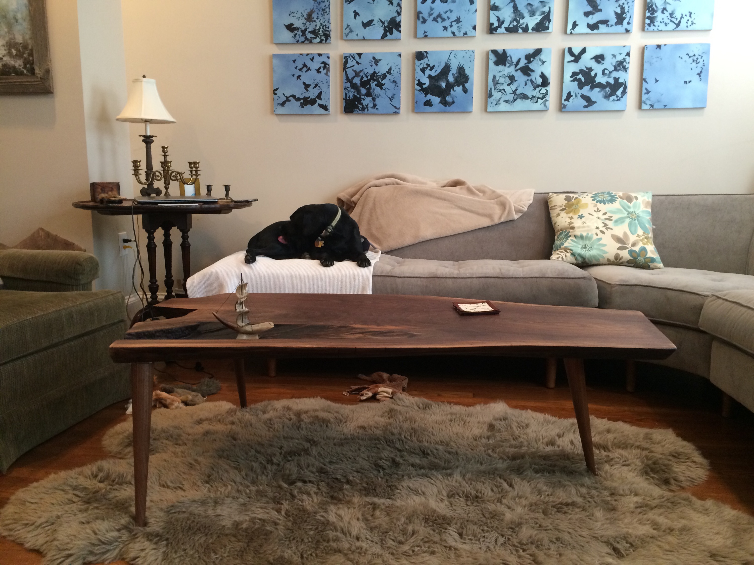 I Just finished making this beautiful black walnut coffee table it really came out great! What an addition to our living room! I finished it with raw linseed oil and linseed oil wax. I have many unique cuts of this first generation tree possibly one would be perfect for your home! Call Marc at (585)313-4950.