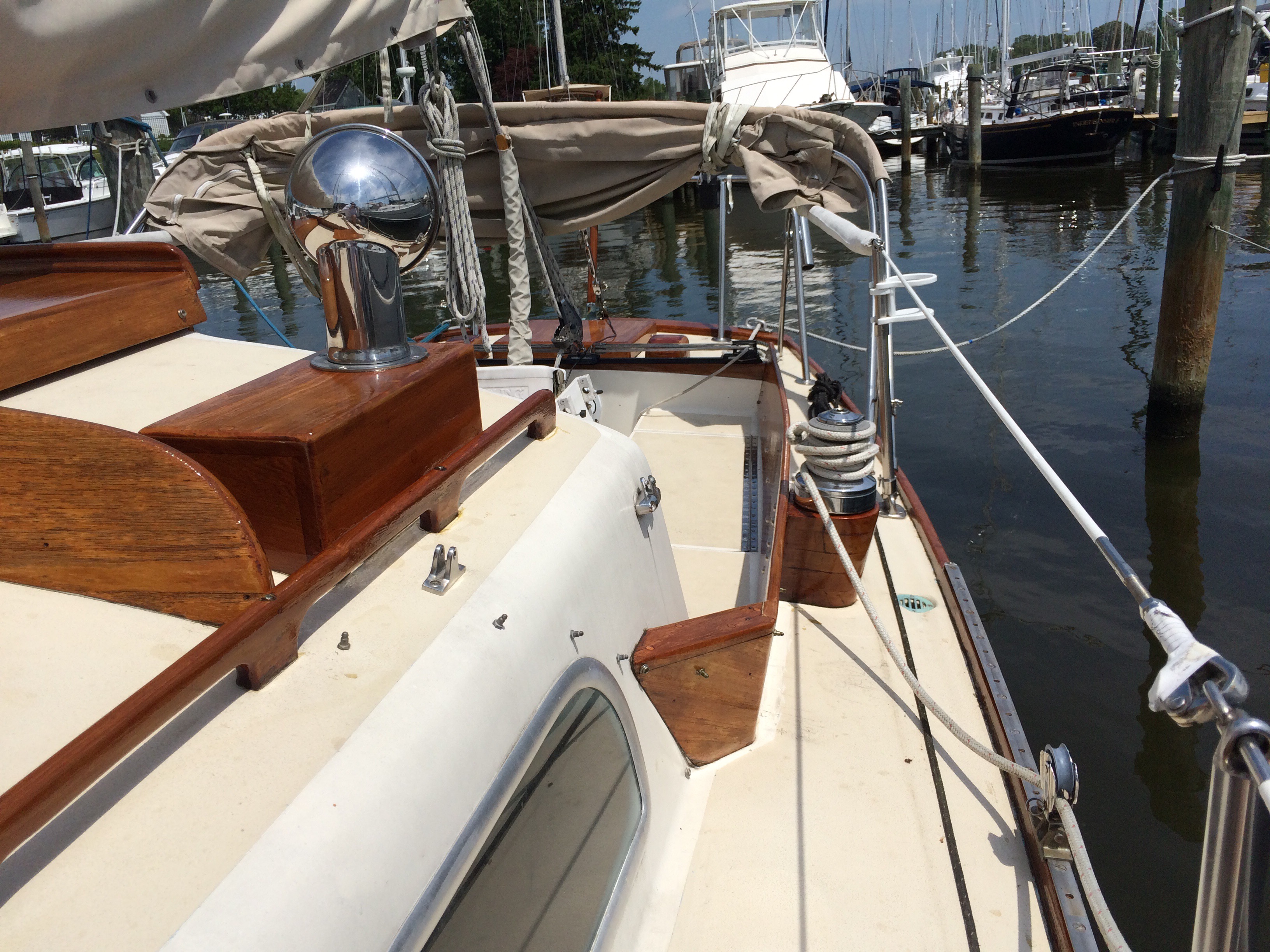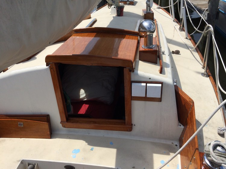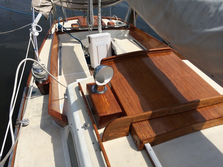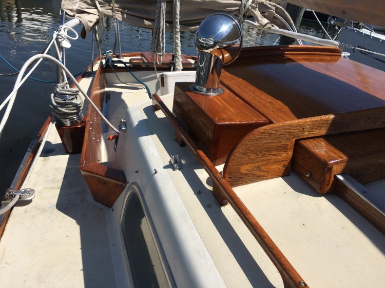 I’ve just applied the fifth and sixth coat of Deks Olji D2 oil varnish to this beautiful classic sloop. The varnish creates great depth and lasting beauty! This varnish won’t peel or crack it just wears off over time. A good cleaning and then recoat is all that is required to bring back this rich, classic, teak bright work!