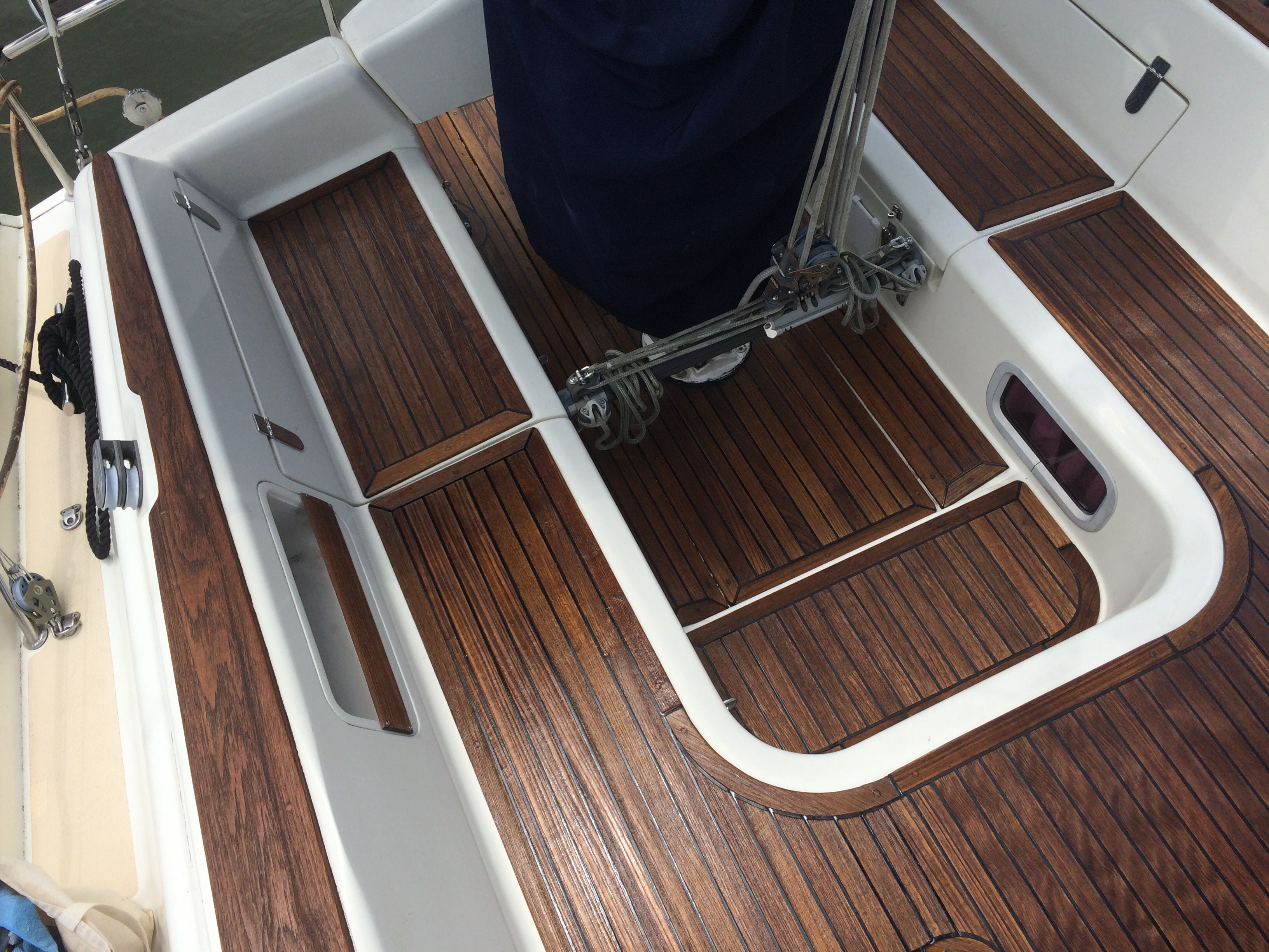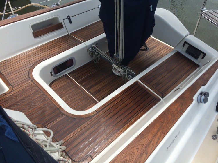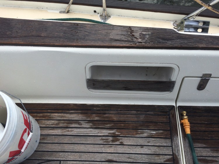 That’s my boat, and Mark did a fantastic job. The teak, now 11 years old, looks like new, and will be protected from the elements. And Mark uses much safer products than the ones you buy at the store, which means a lot when treating seating areas like the cockpit.