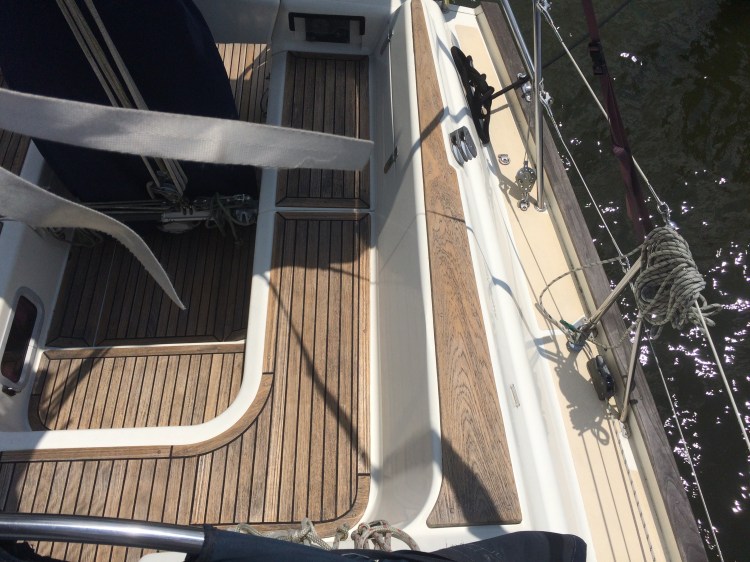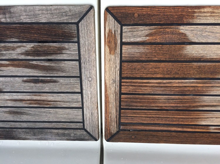 I just cleaned this boats decks with Deks Olji deck cleaner then I will oil them with D1. The cleaner works well with just a bit of effort removes the grey oxidation. More to come after the oiling process!