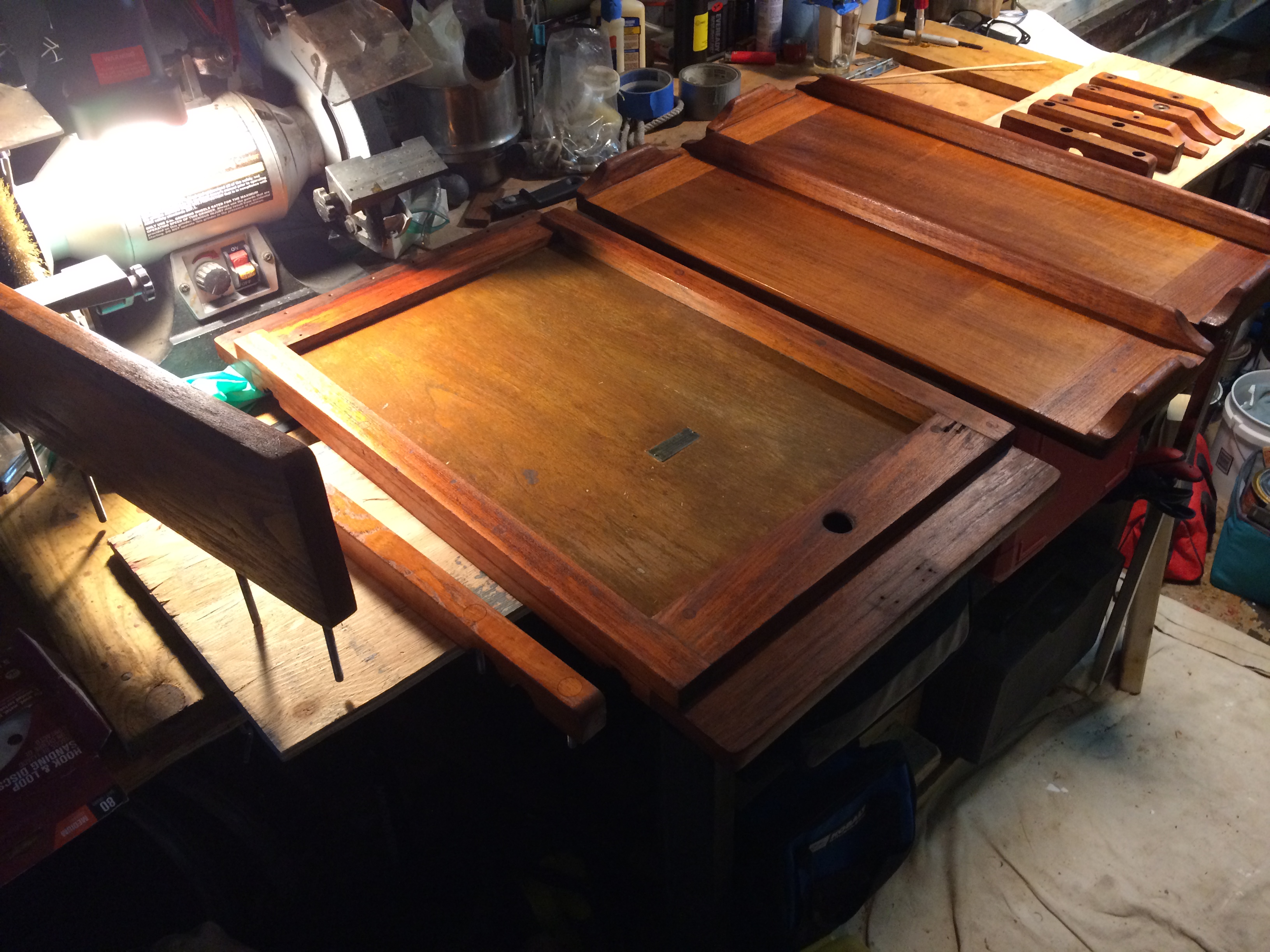Since my work has come to a halt due to Covid-19 I decided to start the teak refinishing on our Catalina 42′. I wanted to show how I start a project and keep track of my time to show an accurate time frame and cost involved. Starting with the cockpit table I removed it from the boat and brought it home work on in my shop. This table is a TeakFlex table that folds out it has many pieces. I first removed all the hardware and then removed all the old varnish with my infra-red paint remover. This took me about five hours. Today I prepped the pieces by sanding them with eighty grit sand paper to open the grain of the wood to accept the oil. I’m using the Deks Olje D1 and D2 varnish. The D1 is the oil which is applied first then six coats of the D2 varnish. This took me a total of about two hours for a total so far of eight hours. I charge $45/hour so its $360.00 so far. I’m anticipating the total cost to be around $500.00 for the cockpit table. Contact me for a quote to refinish your teak!