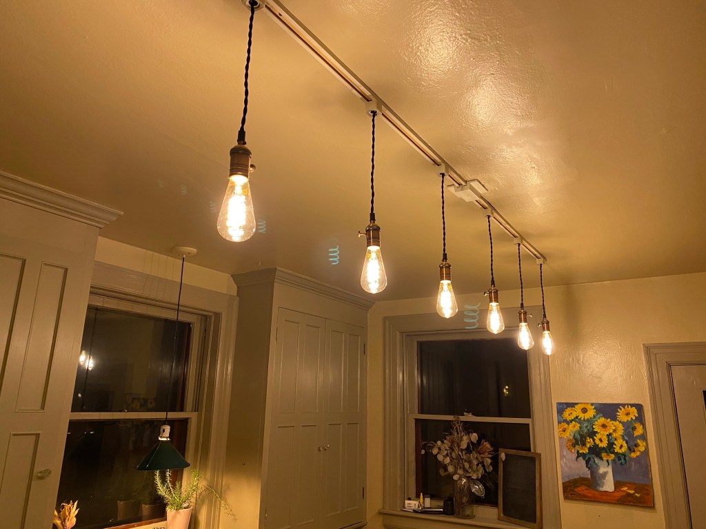 Our new kitchen lighting turned out great. I converted our old track lighting to a very cool pendant light. I used an amber led Edison bulb this light has a very warm feel and goes great with our 1905 house.