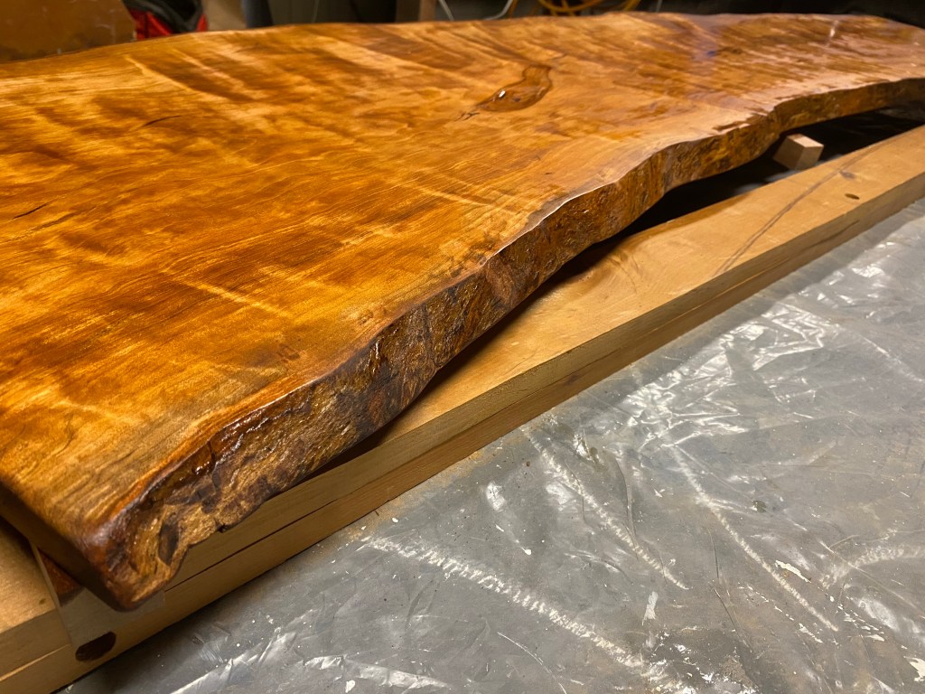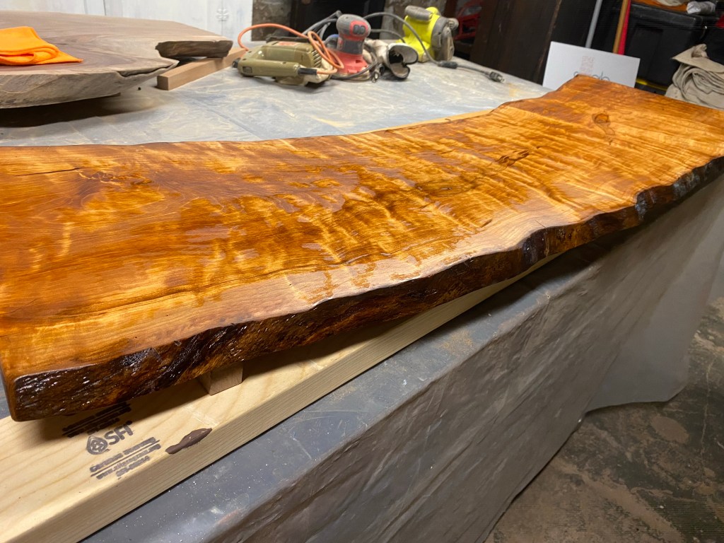 I’m going to turn this piece into a bar. Legs will be wrought iron roughly 36’ high. Just applied raw linseed oil such great grain for cherry. The arched aspect of the piece adds to its warm feel.