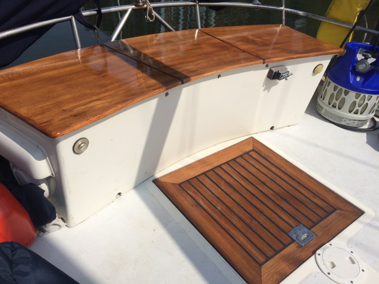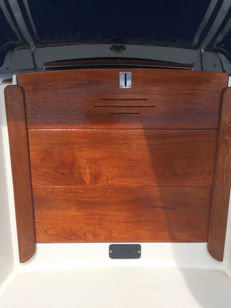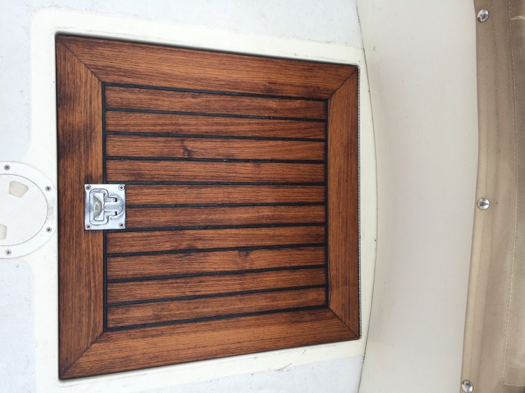 I’m experimenting with Deks Olje a oil varnish on our 1981 O’Day sailboat teak floor panels. I used the whole Deks Olje system starting with the cleaner then the D.1 and ending with the D.2 the oil varnish. The panels were in pretty good shape they just needed a few repairs, cleaning and varnishing. I applied six coats of oil varnish to the panels. This varnish is not a film forming varnish so six coats is a good number of coats to achieve nice depth. The varnish does not peel or crack leaving maintenance easier just clean and re-coat. The varnish went on great no sanding and it looks really great! My boat was built in 1981 look at those floor panels!