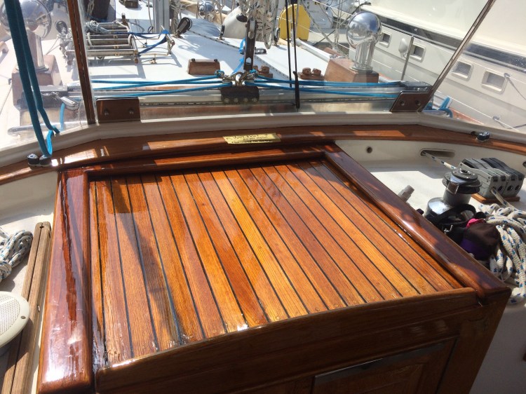 I’ve just applied the fifth and sixth coat of Deks Olji D2 oil varnish to this beautiful classic sloop. The varnish creates great depth and lasting beauty! This varnish won’t peel or crack it just wears off over time. A good cleaning and then recoat is all that is required to bring back this rich, classic, teak bright work!