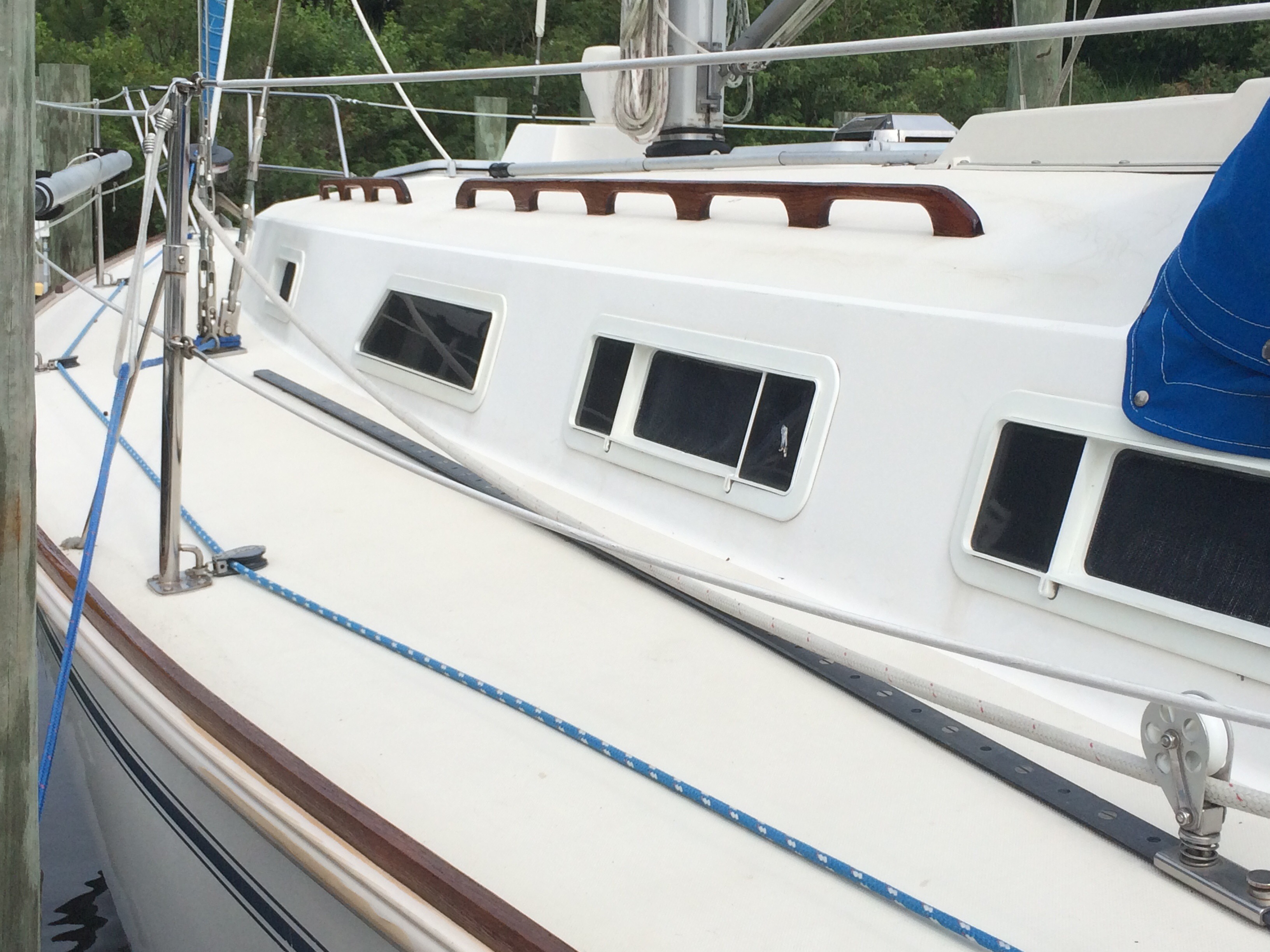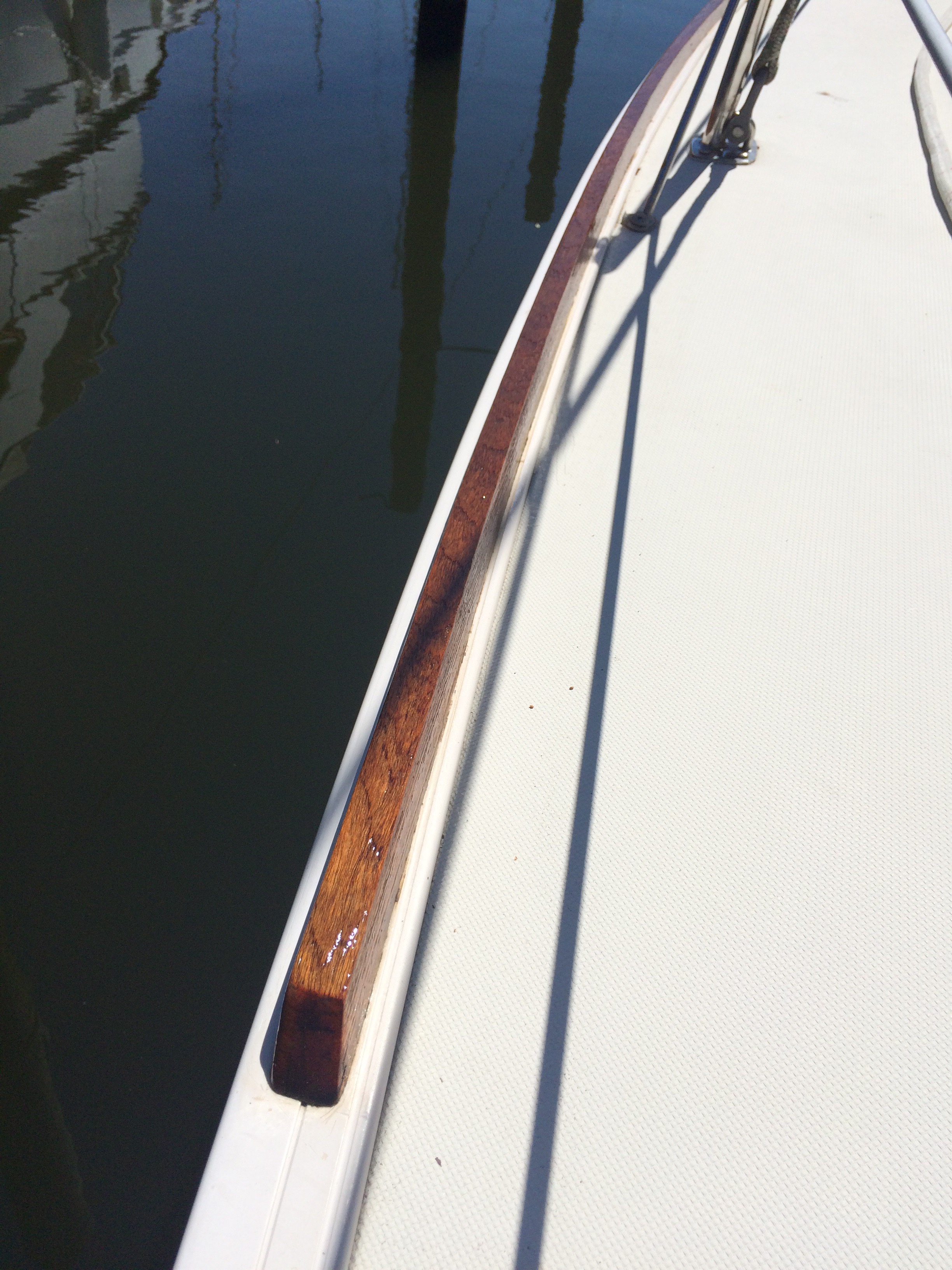 Just completed the bright work on this 36′ Pearson. Deks Olji D1 and D2 oil varnish was used. Six coats were applied producing great depth and rich color! The varnish works great it’s very forgiving and does not peel or crack over time just wares off. Maintenance down the line is limited to cleaning with the deck cleaner and reposting with the varnish.