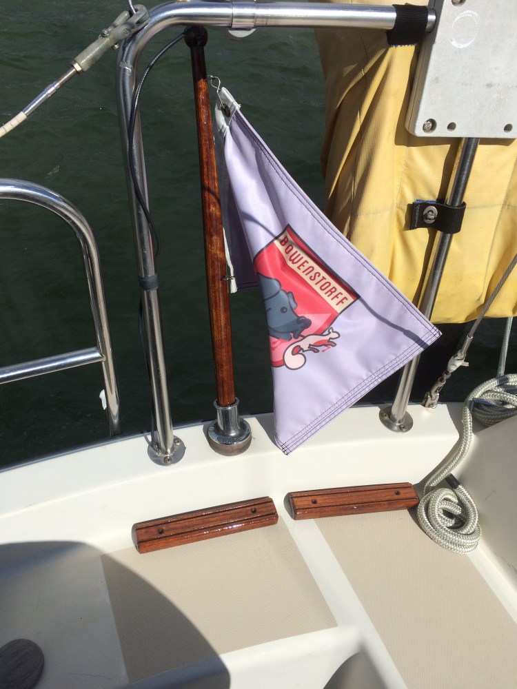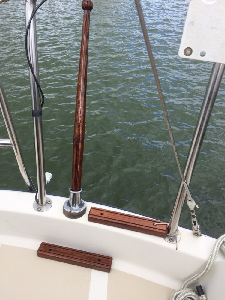 I’m experimenting with Deks Olje a oil varnish on my teak flag pole and ladder steps. I removed the old varnish and preped the pieces using the cleaner, D.1 and D.2 the oil varnish. I put six coats of oil varnish on for maximum longevity. No job is to small! My next project is refinishing teak floor boards for a thirty foot O’Day. I left these pieces out to gage how they hold up over time. The before shot of the flag pole shows just four months of exposure in the harsh marine environment. My method works and will provide years of durability with less work down the road. You can check out my boat at slip E-15. So far one month in the elements on our boat , the pieces look great!