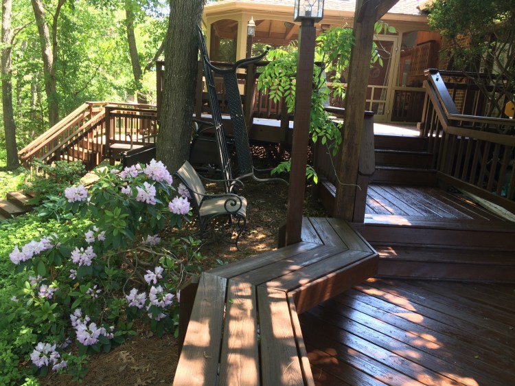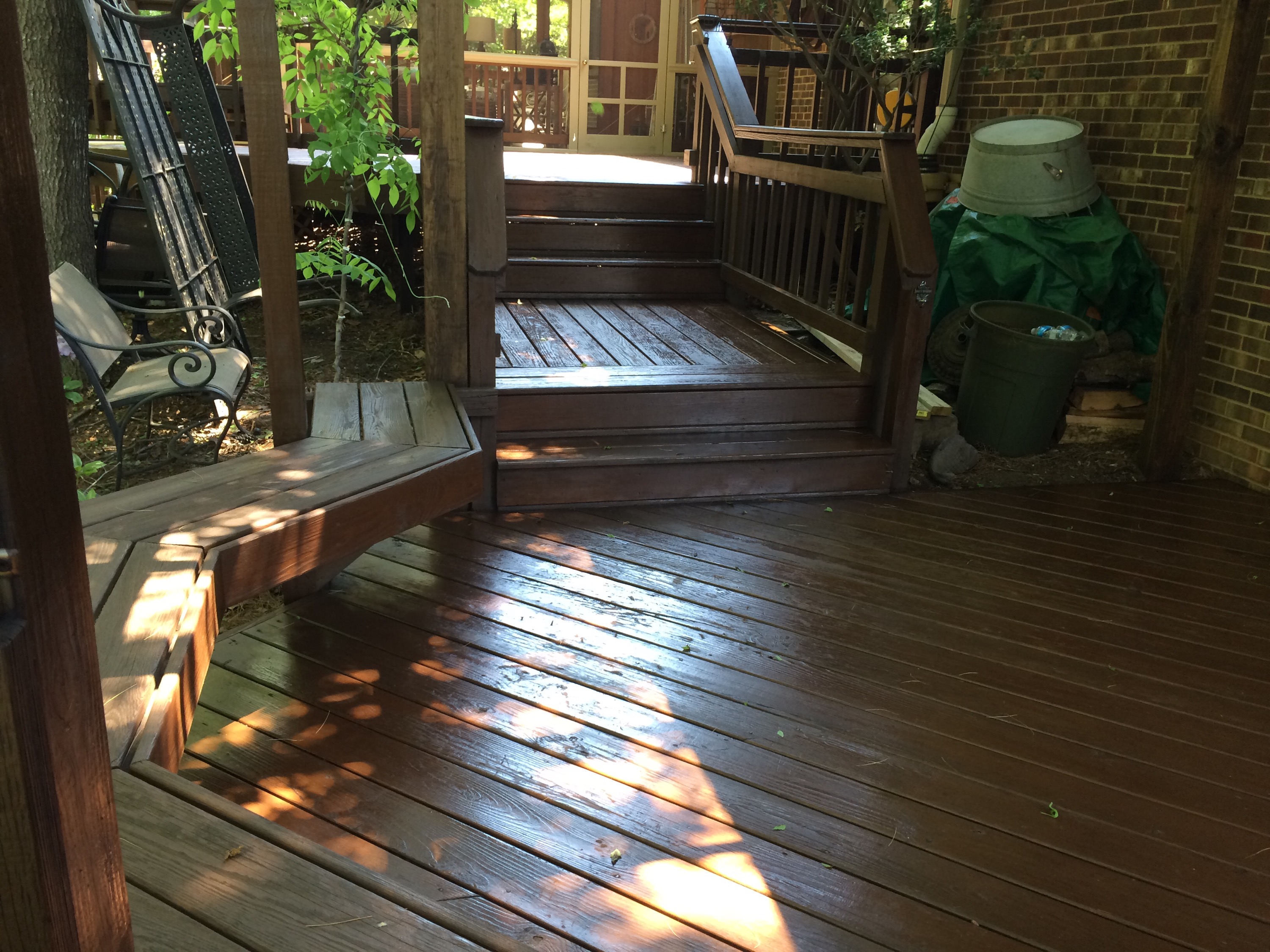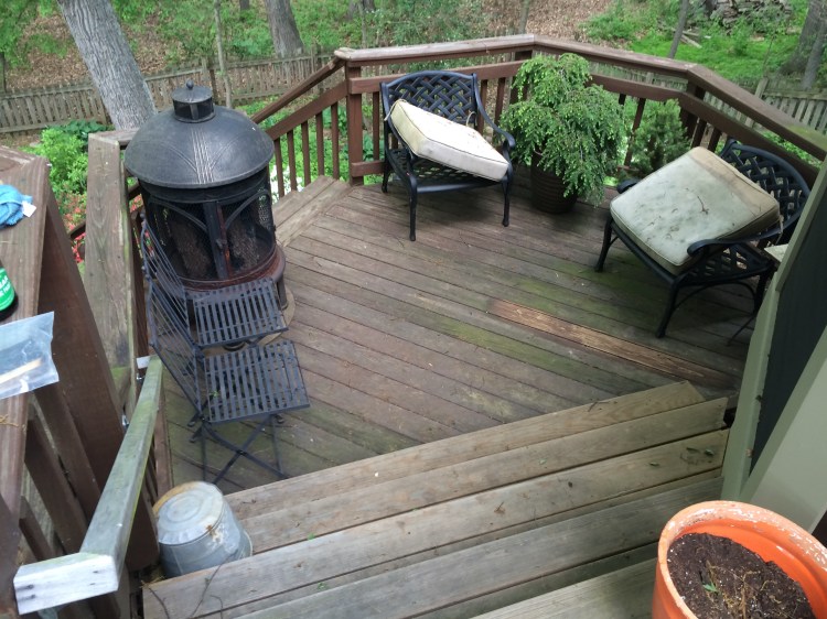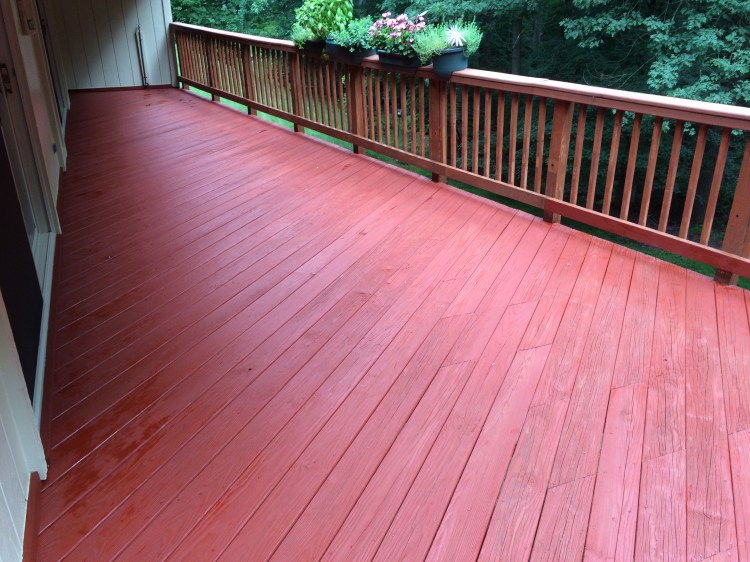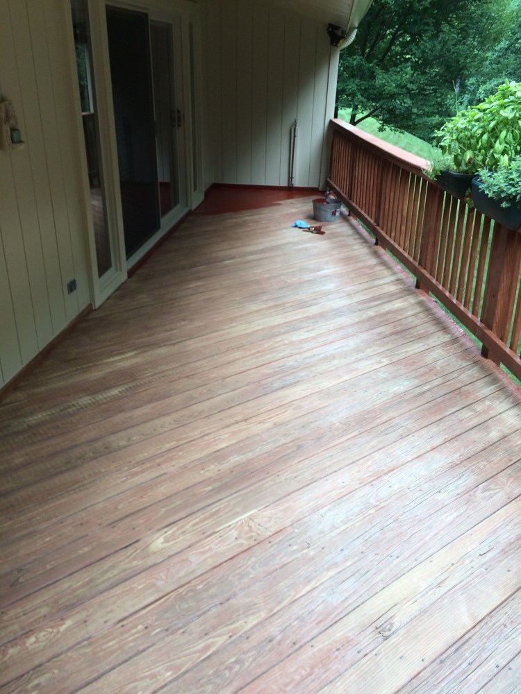 Refinishing decks with pine tar and raw linseed oil is a supier way to preserve your deck using chemical-free products that were meant for wood. No need to power wash, which puts too much water into the wood and ultimately damages when finished with acrylic products that trap the moisture inside, creating mold and rot. My method is to first clean the deck with linseed oil soap, then apply the raw linseed oil and pine tar mixture. One coat is usually one coat is enough. This works best when the deck has not been previously painted or stained prior. Light sanding may be required to allow the products to fully penetrate into wood.