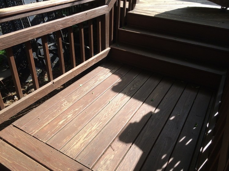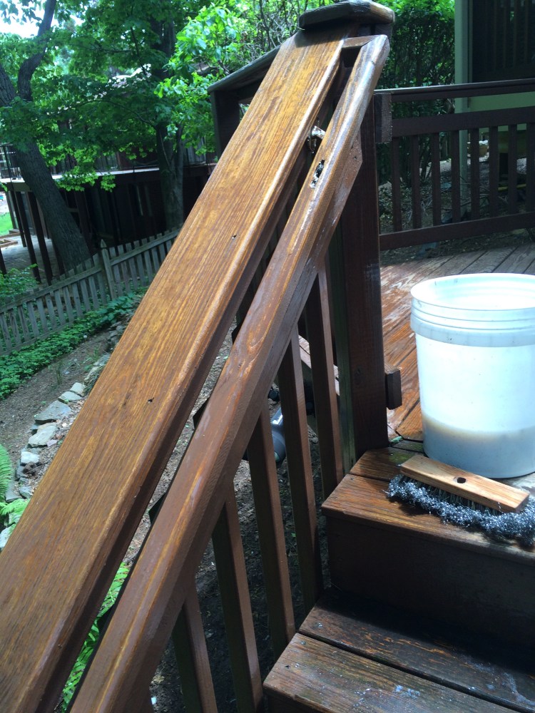 This pressure treated railing was dried out and the acrylic stain that was on it had failed plus the wood warped. I remove the old layer of stain with my in fared paint remover then oiled the wood with raw organic linseed oil and finished it with linseed oil varnished. over a year later it still looks great. The longevity of this finish is well over ten years!! Unheard of in direct sunlight.