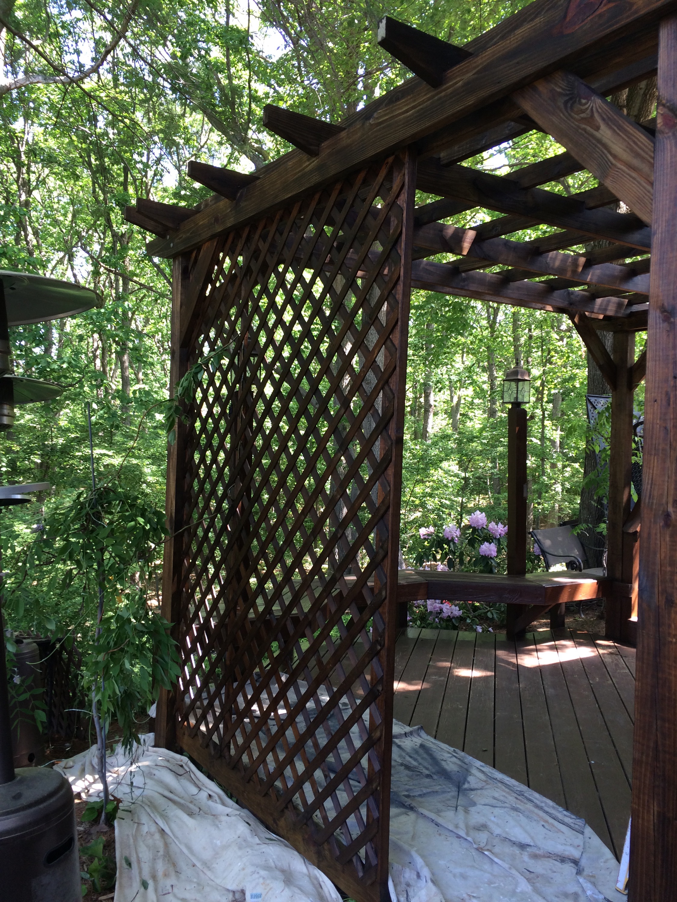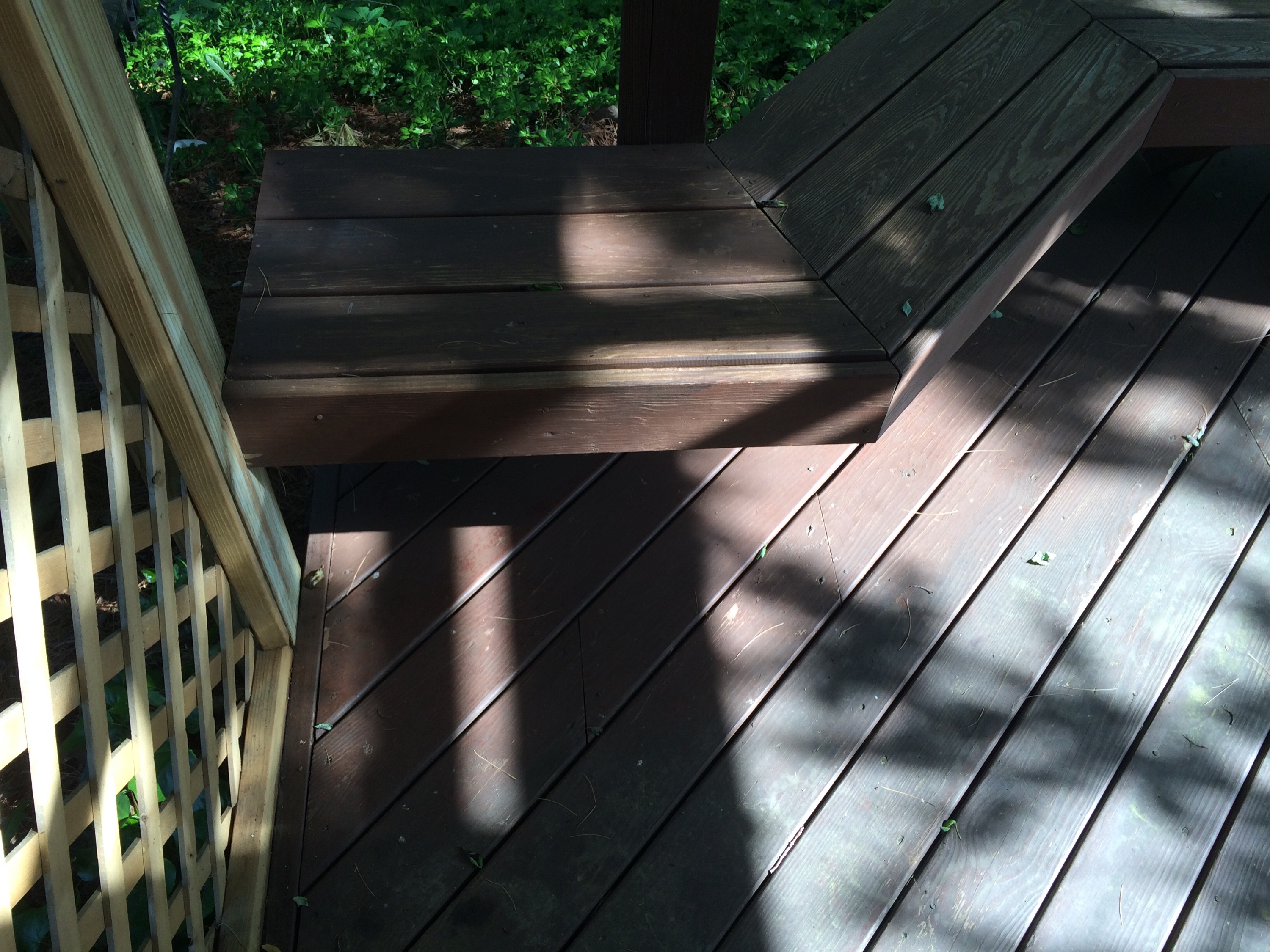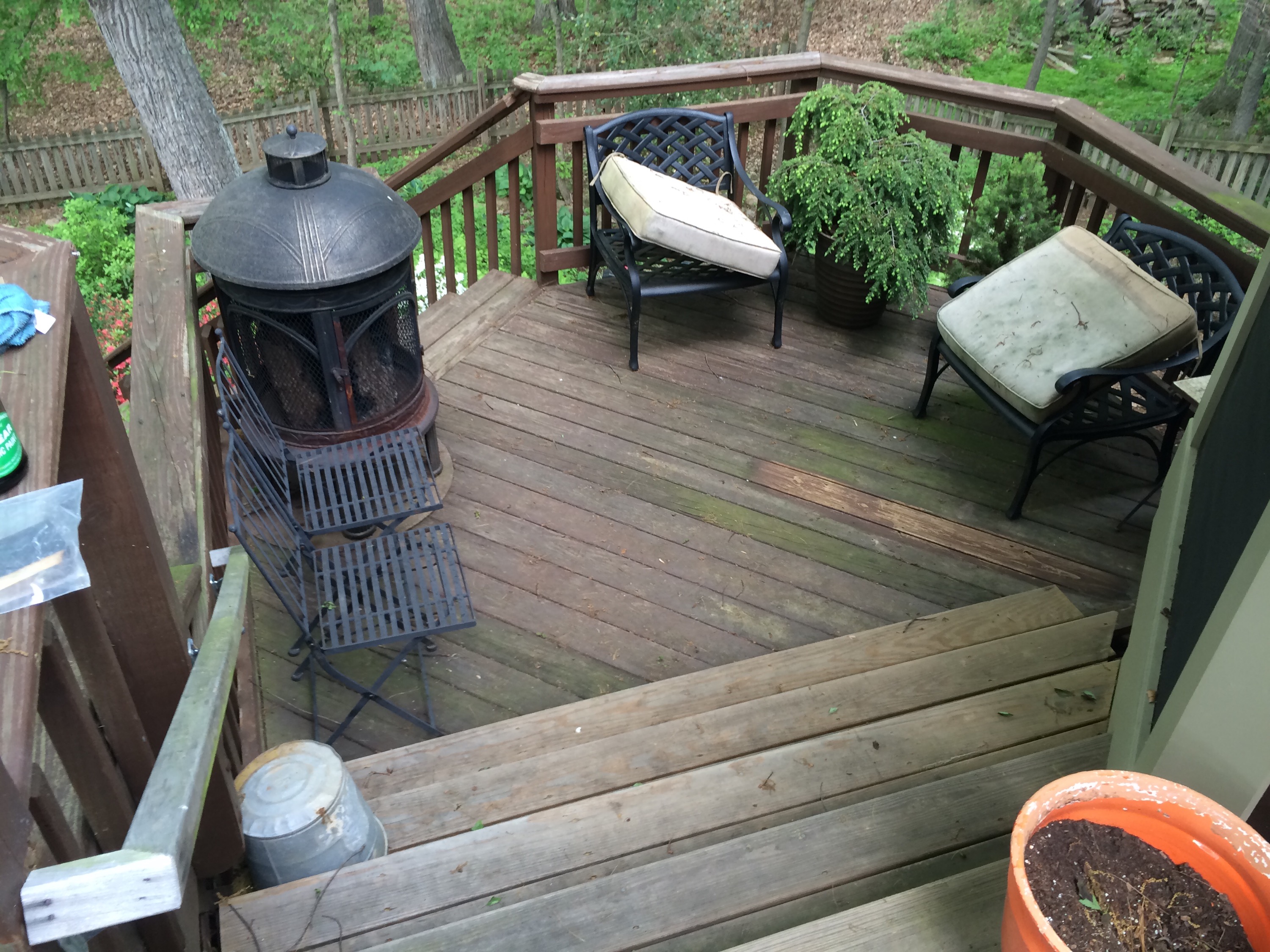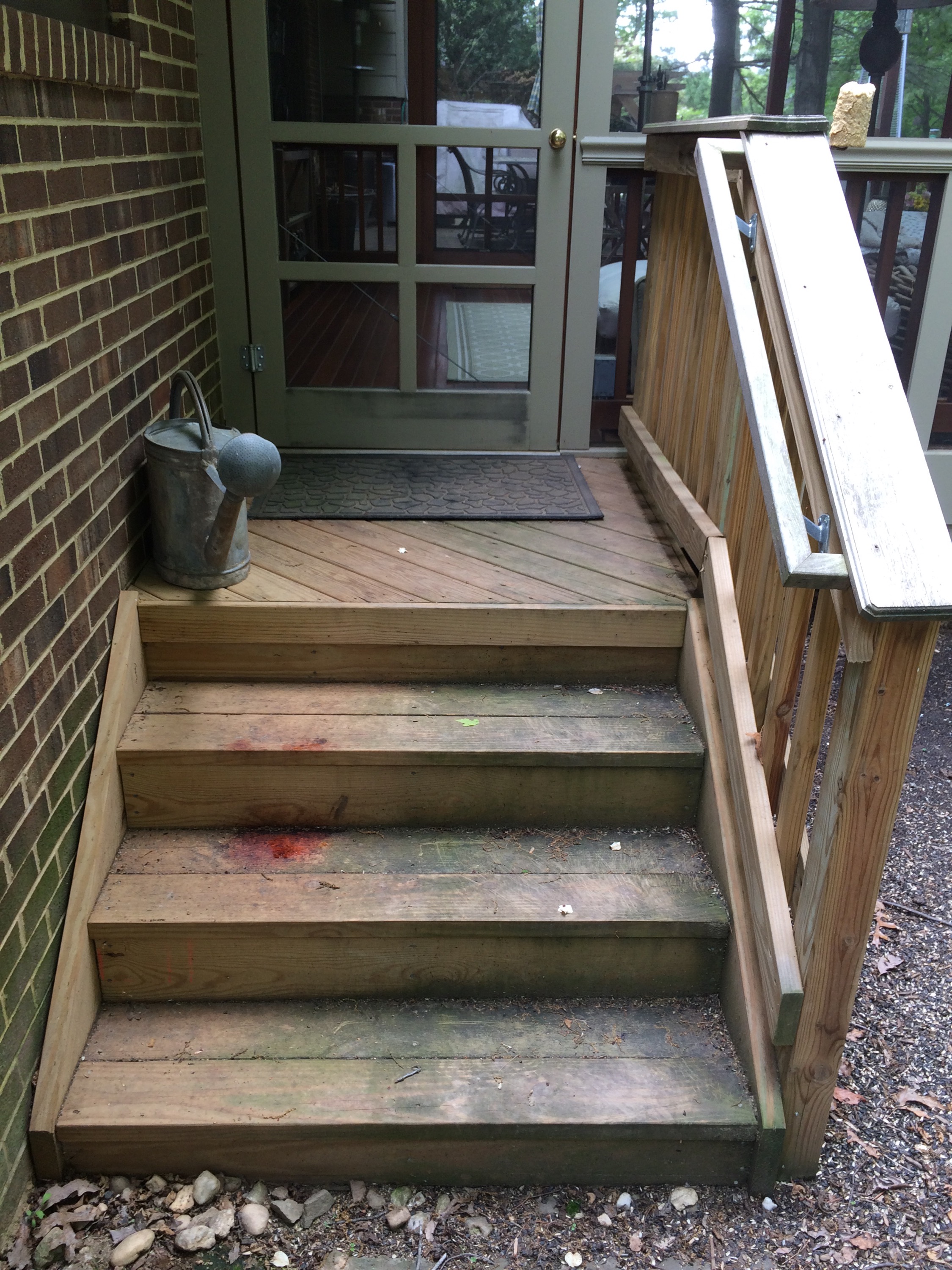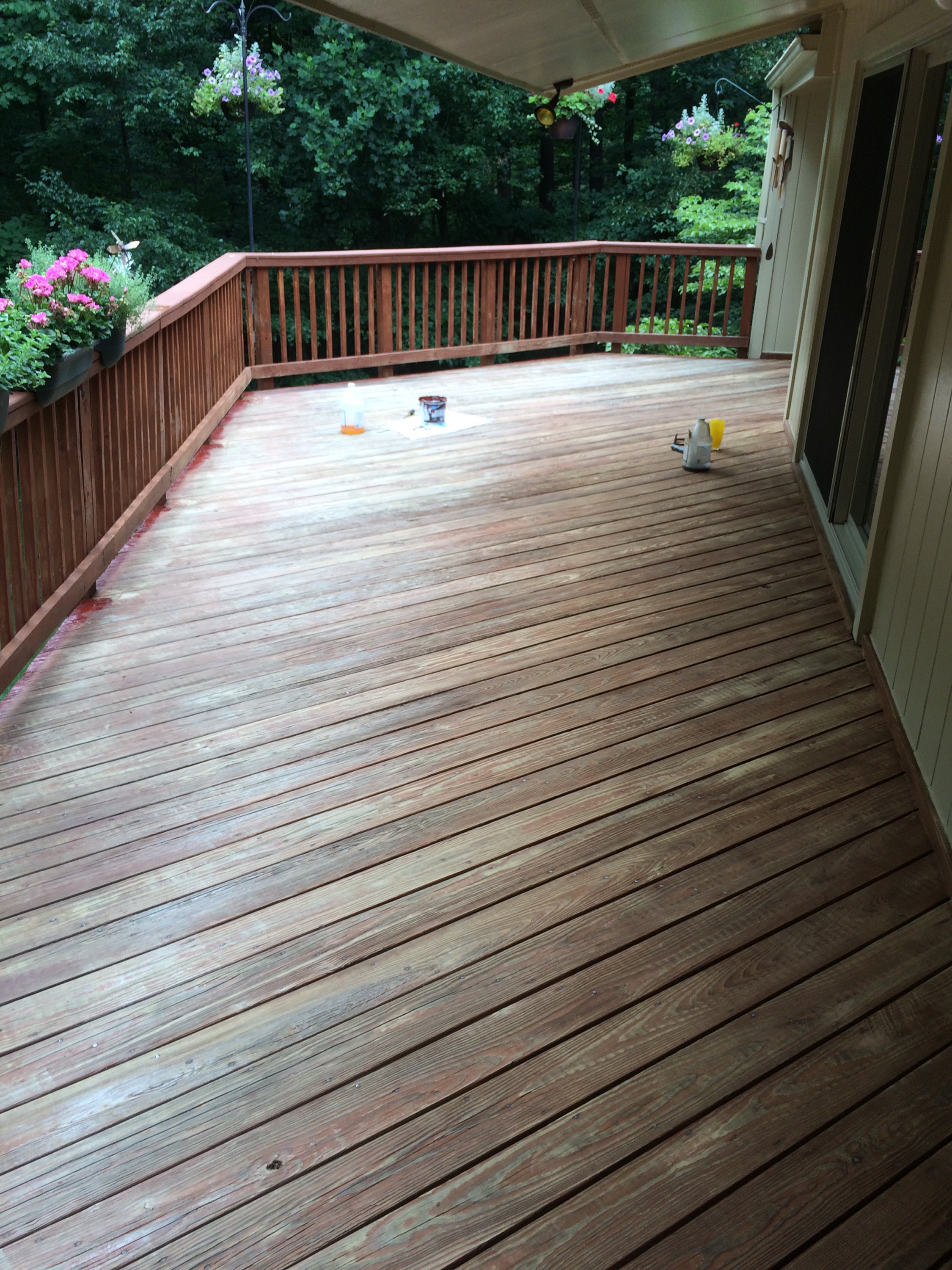 This pressure treated railing was dried out and the acrylic stain that was on it had failed plus the wood warped. I remove the old layer of stain with my in fared paint remover then oiled the wood with raw organic linseed oil and finished it with linseed oil varnished. over a year later it still looks great. The longevity of this finish is well over ten years!! Unheard of in direct sunlight.