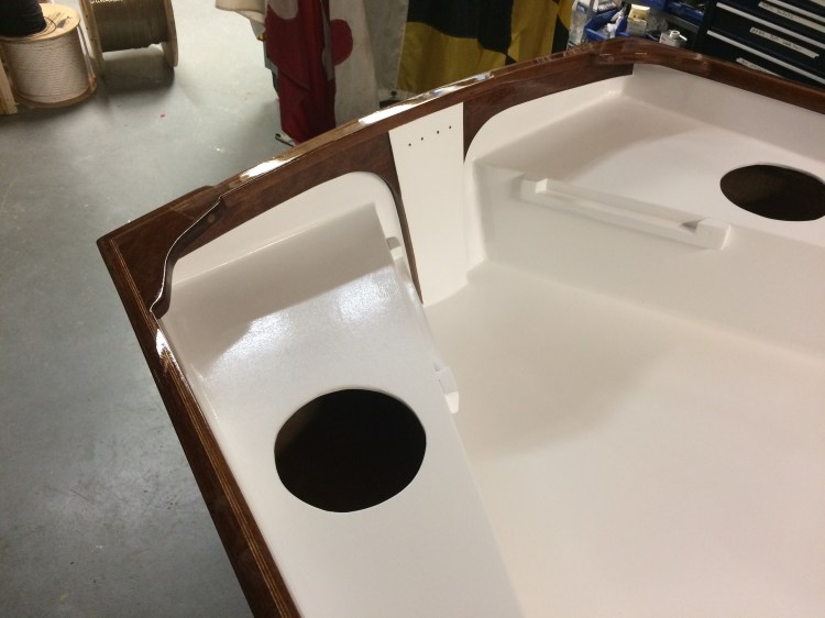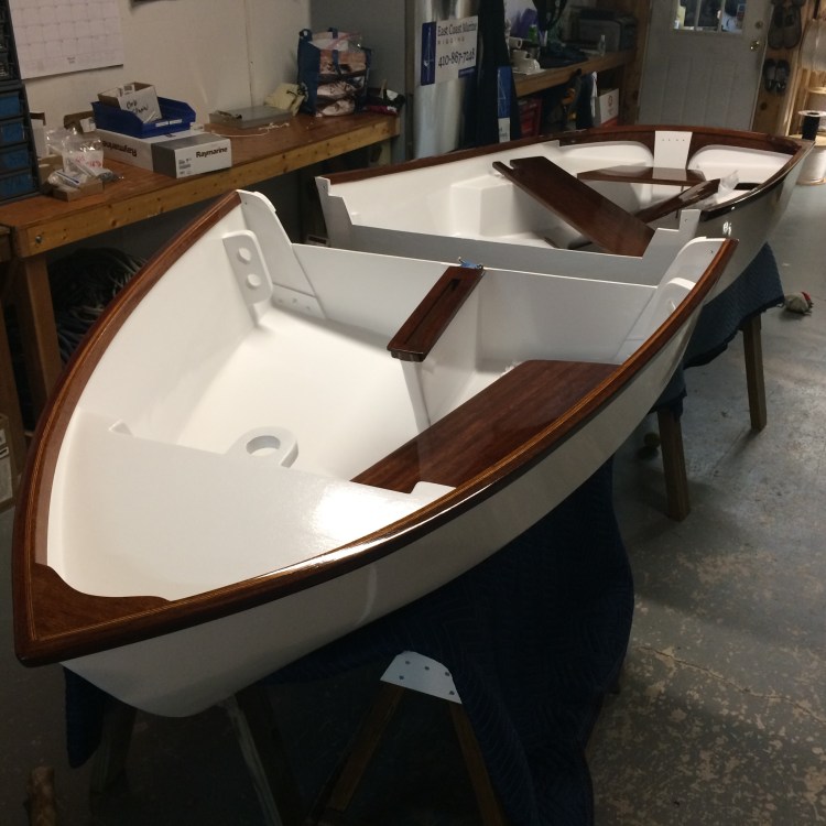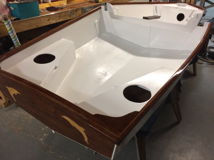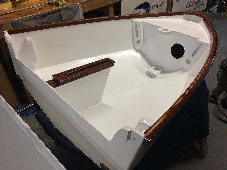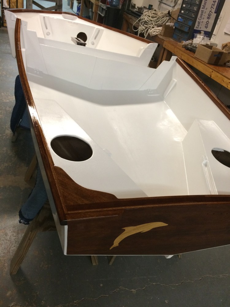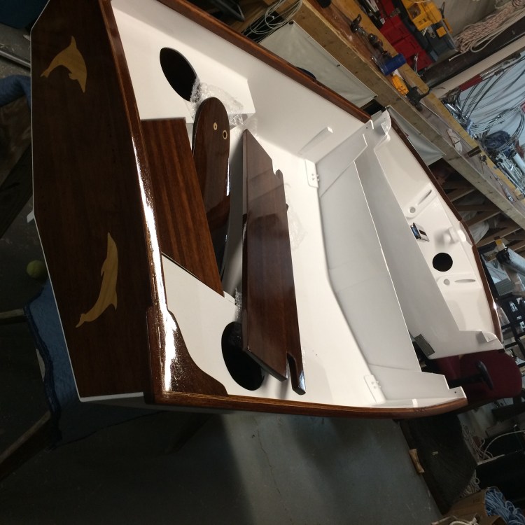 Just finished painting this unique sailing dingy. Coming together nicely with the mahogany brightwork gleaming! I used Deks Olje for the varnish and Brightsides for the paint.