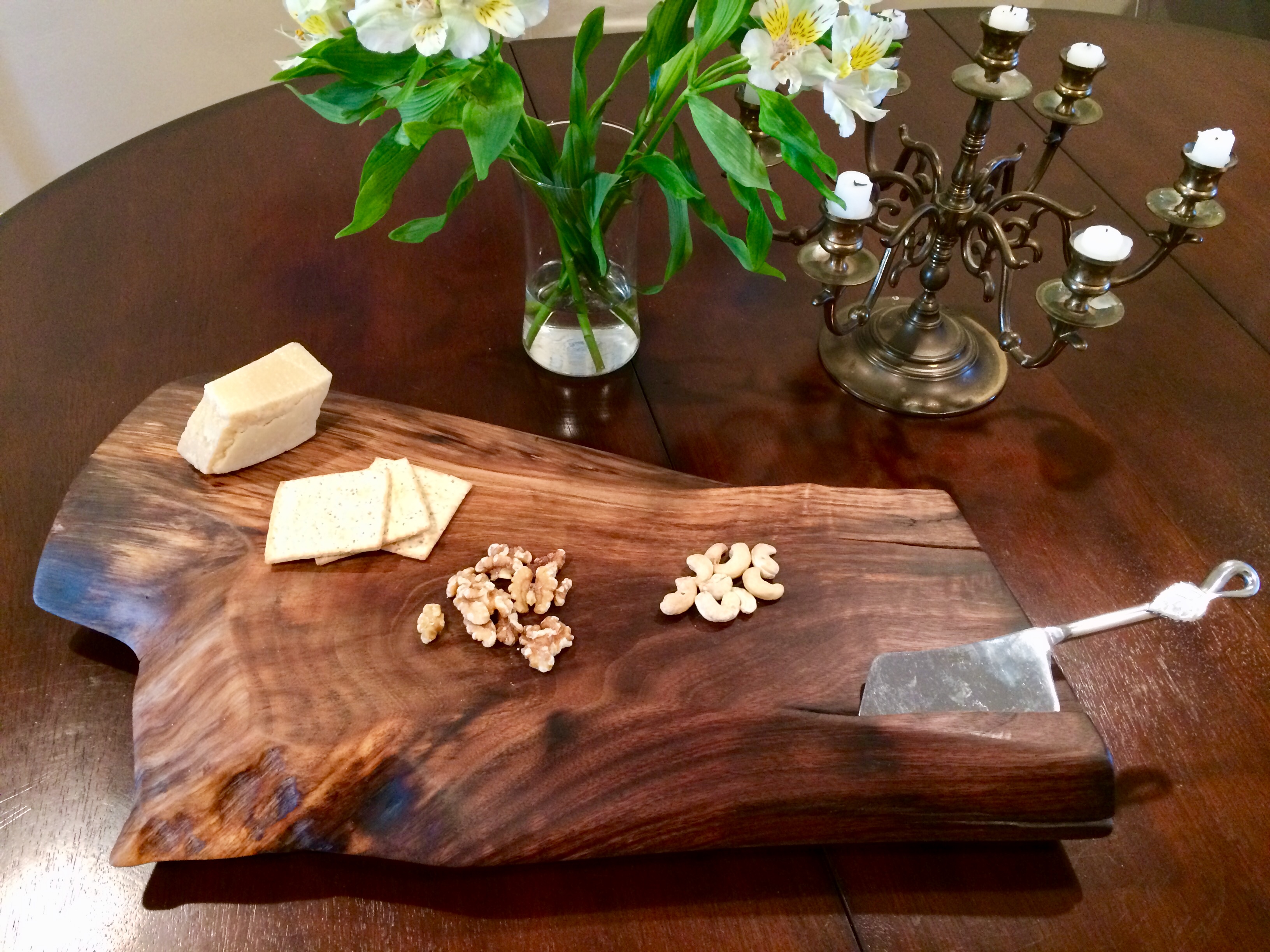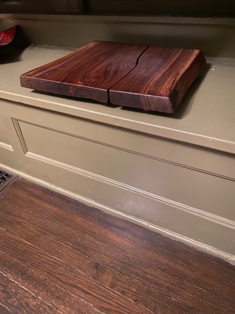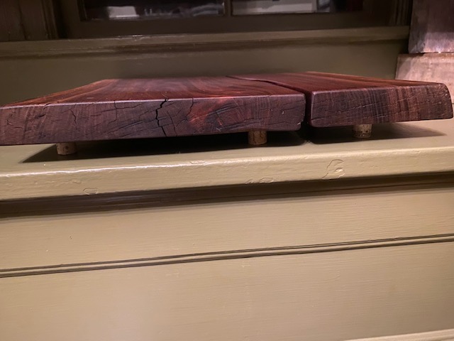 Naturally split board creates two beautiful cheeses boards sold together. The feet are recessed wine corks! Just sold!