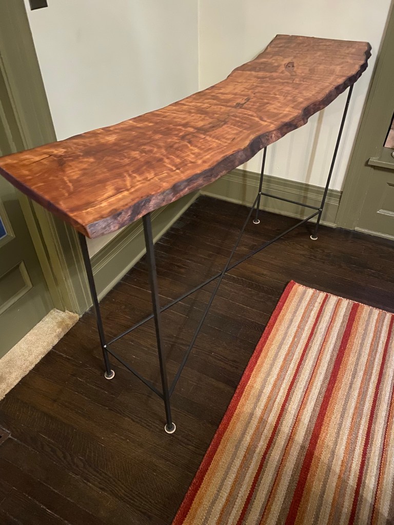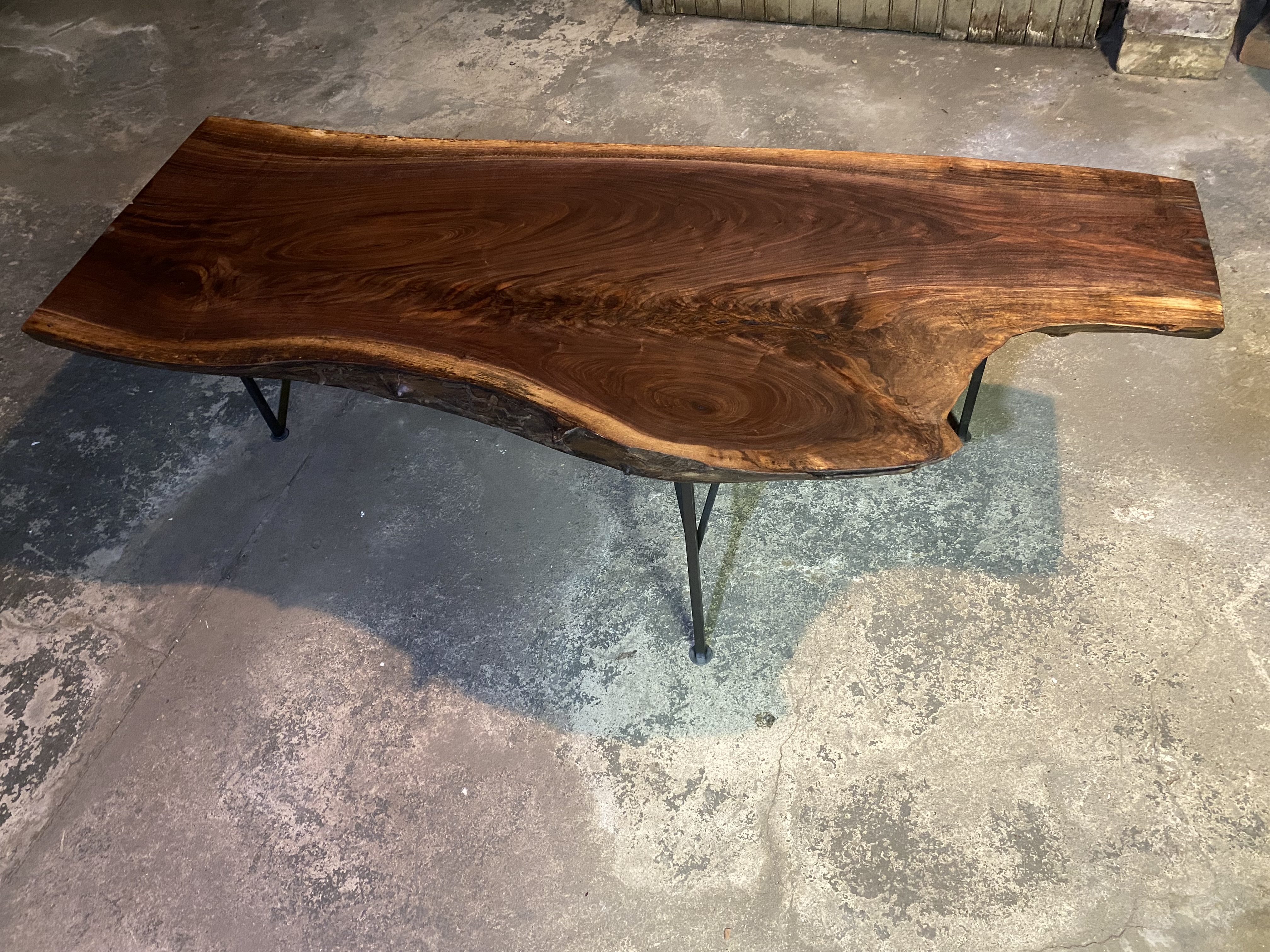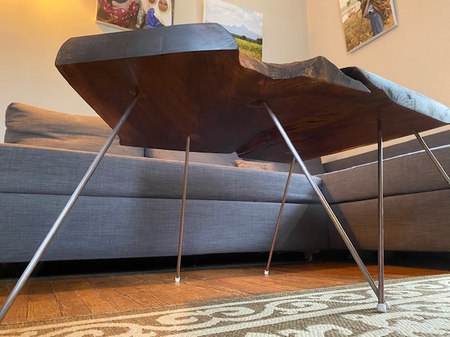 The legs are fabricated out of steal my design very solid platform. Which creates a display for this beautiful piece of black walnut. The finish is raw linseed oil with a linseed oil wax top coat. My original table shown above still looks great after eight years.