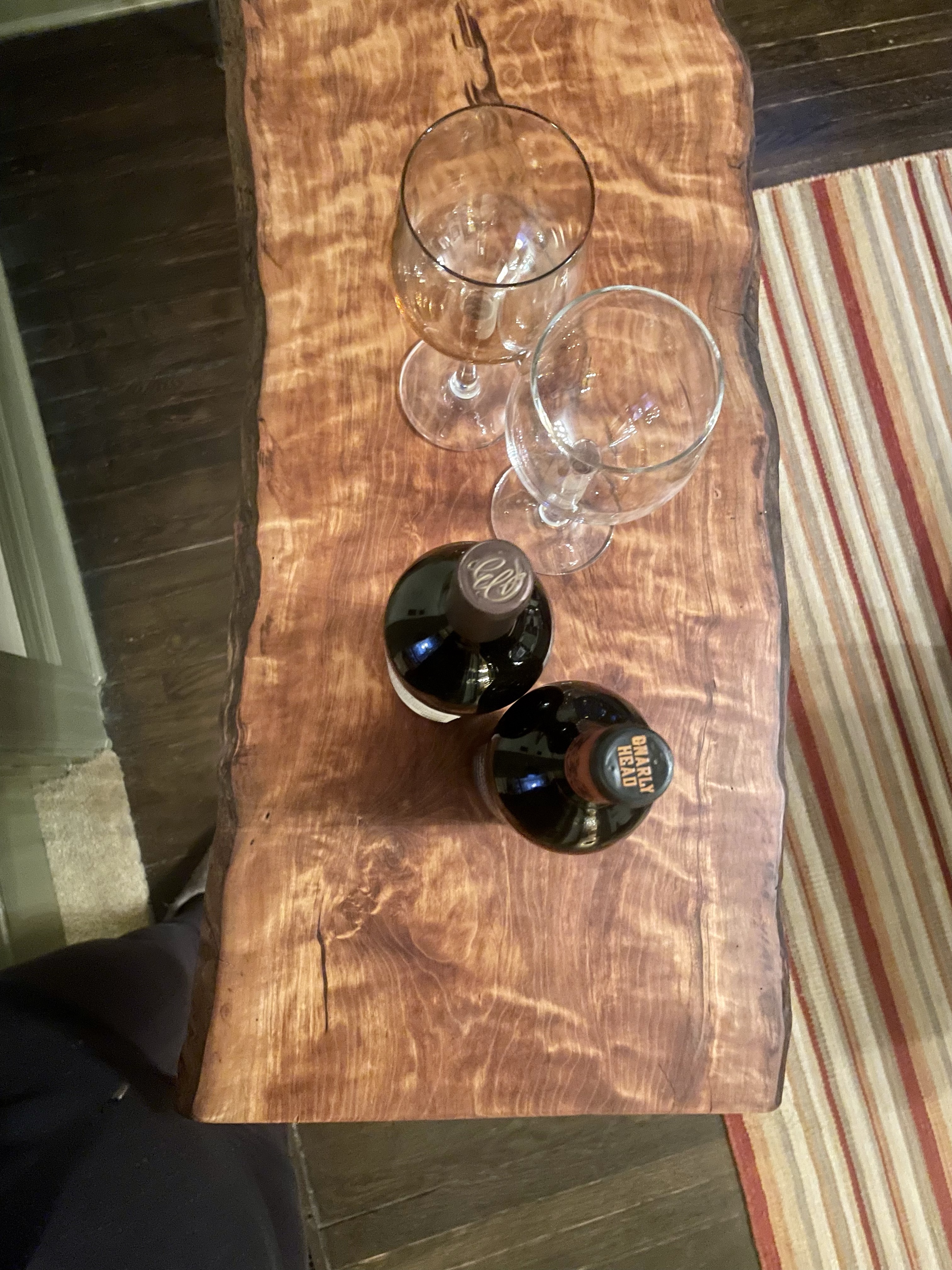 Just completed this new live edge cherry coffee table. The grain is beautiful. The cherry top sits upon a mahogany stand that I designed. There are wooden pegs that keep the top in place. The table can be fully disassembled. There is a Japanese feel with the ached aspect of the cherry top and simplicity and beautiful form.