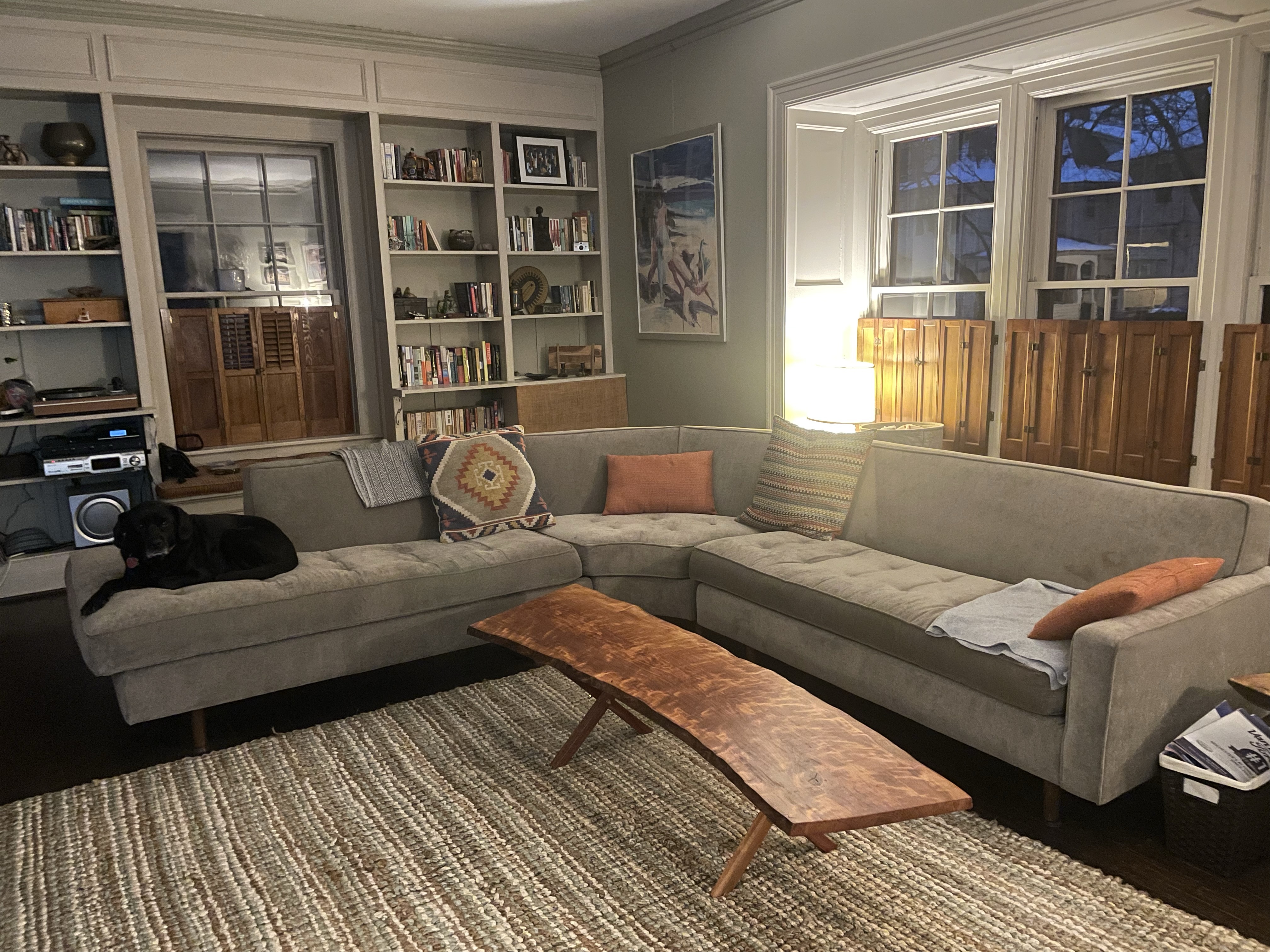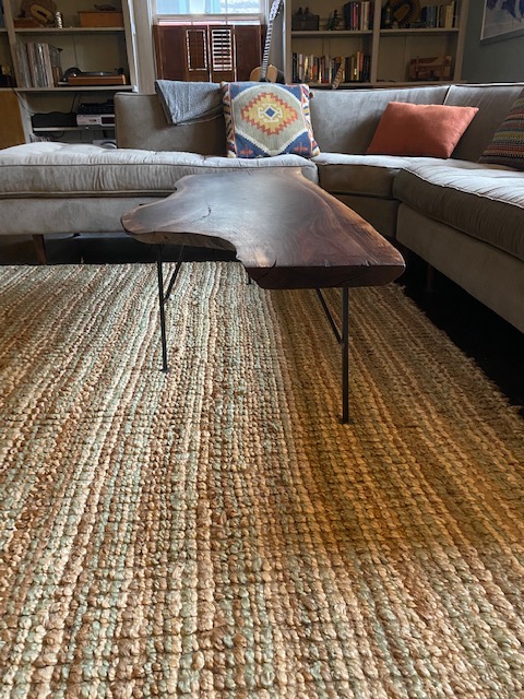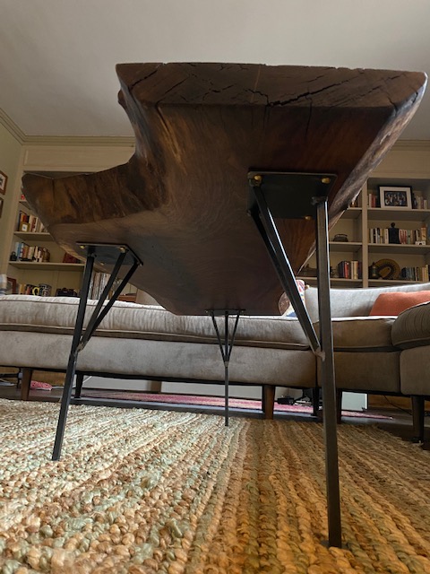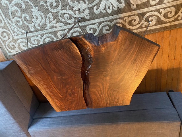 I had fun making this piece it was split almost all the way through. Instead of fixing the piece. Embraced the idea of a split piece. It can be used together or apart as a coffee table and an end table. The legs are steal rod ruffly 3/8 sunk into the walnut with epoxy. I wanted to created a suspended feel to showcase the beautiful wood grain. The split sections are epoxied revealing a smooth textured aspect of the piece. The finish is many coats of raw linseed oil followed by a finish coat of linseed oil wax.